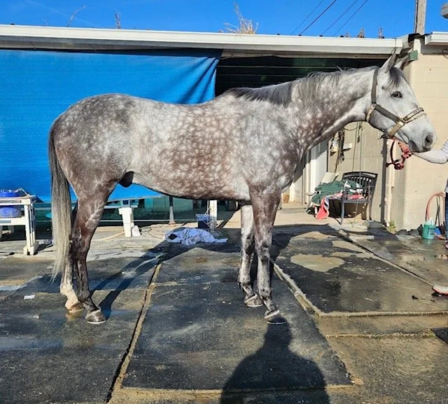 Bowed right front tendon. Will need about 8m-1yr lay up. Really nice and easy to gallop on the track. Not hot or temperamental. Easy to get along with. By Grazen out of an Afleet Alex mare.