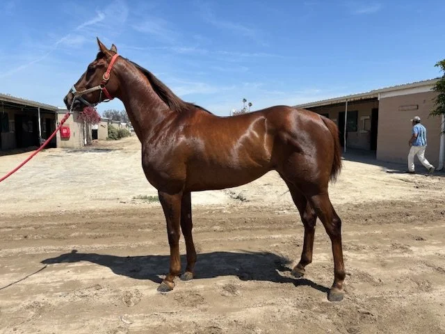 26 starts out on the track. Has good bone, good feet with heel, strong body. Is high energy and could use down time mentally to come down from the pressures of the track. Will need an experienced rider/handler to help him with the transition. Sound.