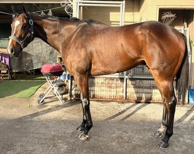 15 starts out on the track. Very sweet, kind, gentle for a racehorse with such a good brain. By Street Sense out of a Crimson Time mare. Legs are cold and tight.